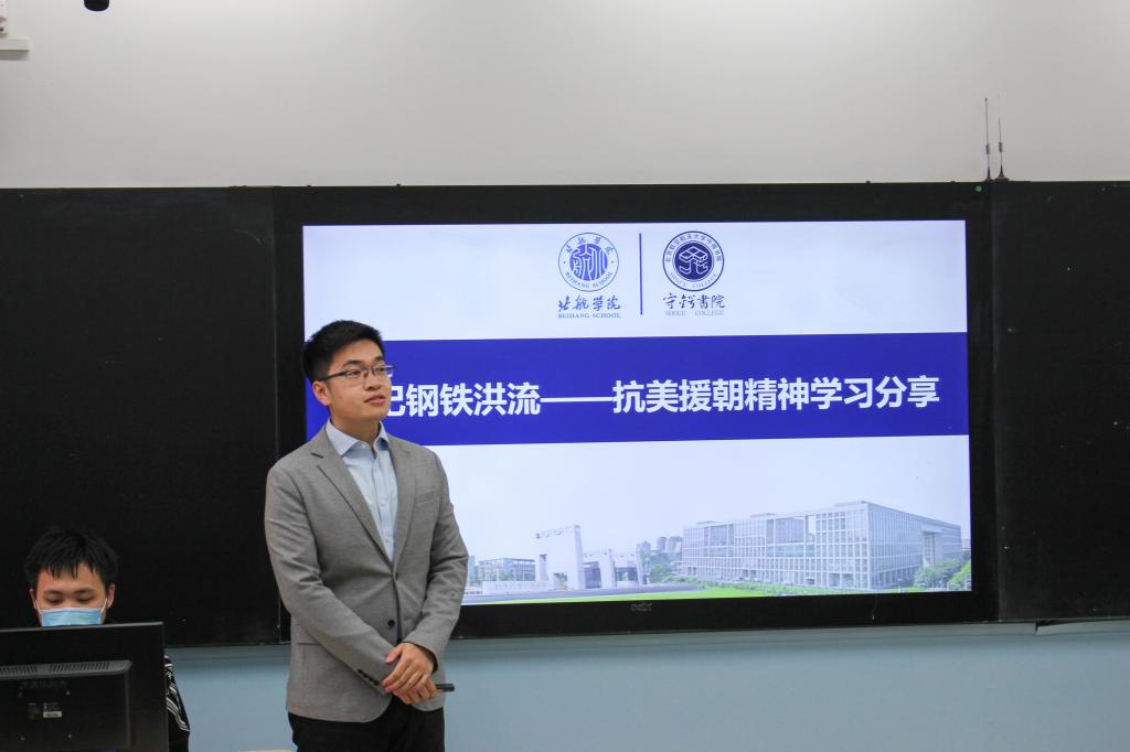 主题团日活动主要分为三个部分。在第一部分“铭记钢铁洪流”中,专职辅导员王涛结合亲身参加“纪念中国人民志愿军抗美援朝出国作战70周年大会”的经历,以活泼新颖的形式为同学们带来《抗美援朝精神学习分享》主题团课,带领同学们共同回顾历史、学习抗美援朝精神、致敬志愿军英雄。在随后的抗美援朝知识竞赛中,同学们积极参与竞答、“各显神通”,在比赛中收获知识、增长见识。