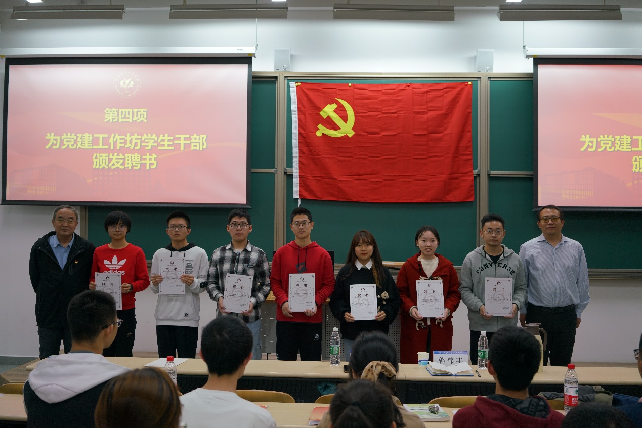 党委书记马军,执行院长郭伟丰为党建工作坊学生干部颁发聘书,随后各部门负责人介绍部门职责、党建工作坊活动开展形式与招新工作。