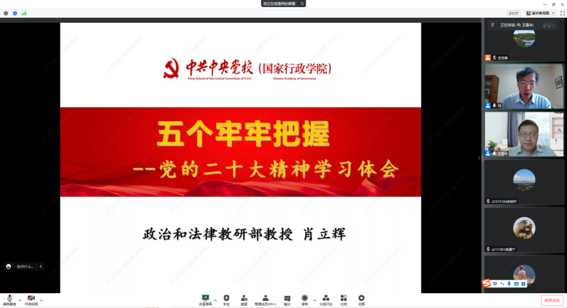 肖立辉教授阐释了党的二十大报告的主题,点明了党的二十大的历史地位和意义,指明大会为党和国家事业明确前进方向、是我们党团结带领全国各族人民在新时代新征程坚持和发展中国特色社会主义的政治宣言和行动纲领,从牢牢把握过去5年工作和新时代10年伟大变革的重大意义、牢牢把握新时代中国特色社会主义思想的世界观和方法论、牢牢把握以中国式现代化推进中华民族伟大复兴的使命任务、牢牢把握以伟大自我革命引领伟大社会革命的重要要求、牢牢把握团结奋斗的时代要求五个方面解读了大会精神。他指出,习近平总书记参加党的二十大广西代表团讨论时提出的 “五个牢牢把握” 是对党的二十大报告最精准的解读、最权威的辅导,是贯彻落实党的二十大精神的重要思想指引和行动指南。要按照“五个牢牢把握”重要要求,坚决把思想和行动统一到党的二十大精神上来。