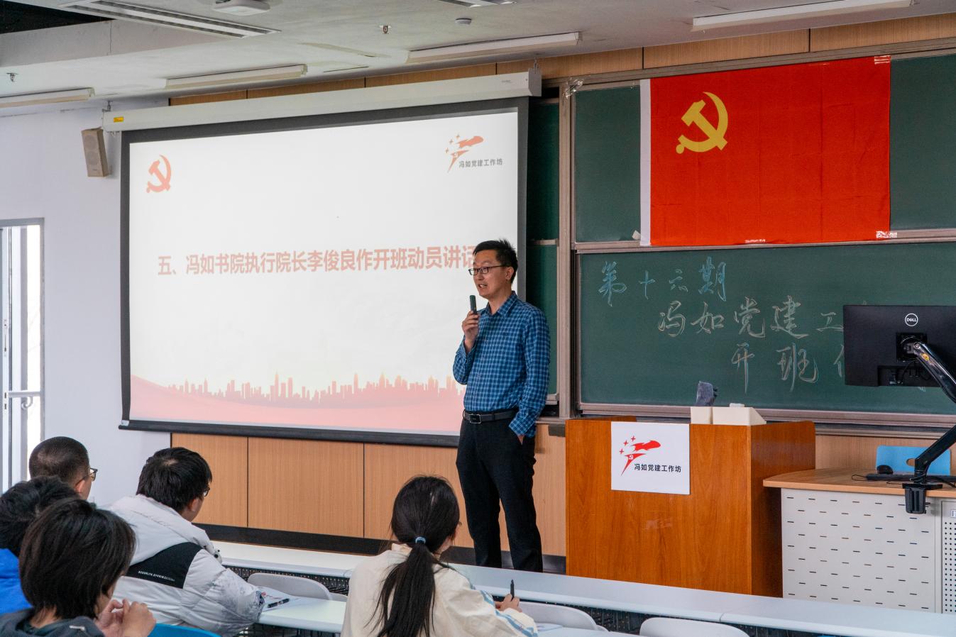 冯如书院执行院长李俊良作开班动员讲话。他强调,各位学员要切实提高政治意识,加强党性锤炼,坚定理想信念,矢志不渝地向党组织靠拢,并嘱托全体学员,在党建工作坊中不仅要加强理论学习,夯实向党靠拢的思想基础,而且要投身社会实践,以实际行动践行党的宗旨,真正做到学思用贯通、知信行统一。