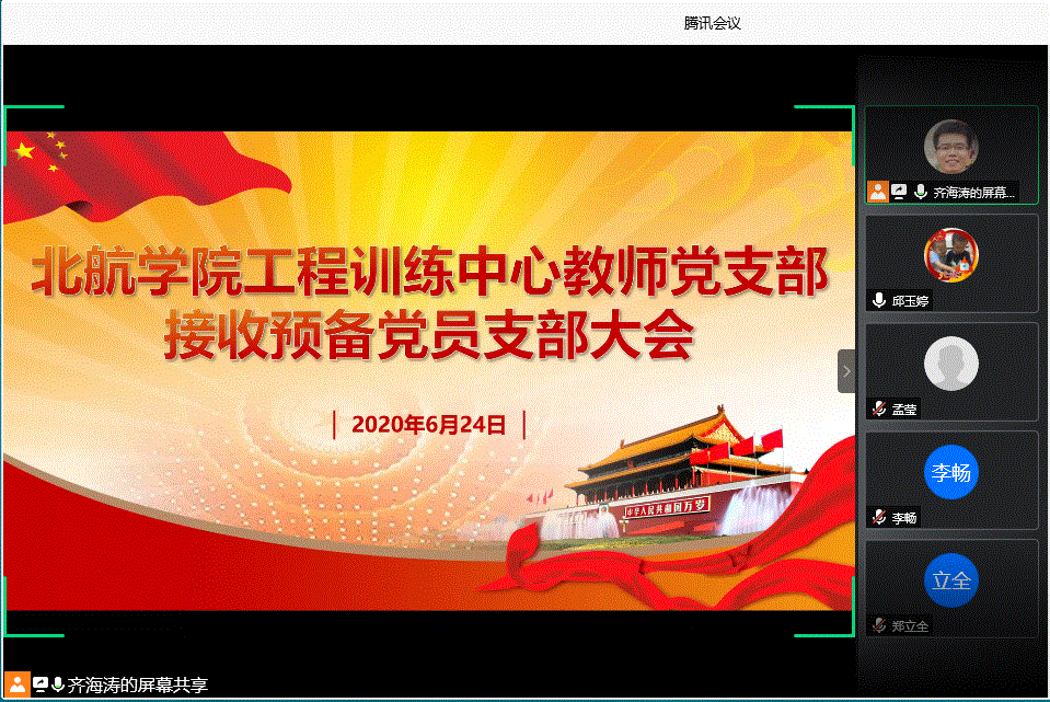 (通讯员 邱玉婷)6月24日下午,工程训练中心教师党支部在线上举行发展党员大会,支部党员和发展对象李畅参加会议,会议由支部书记齐海涛主持。
