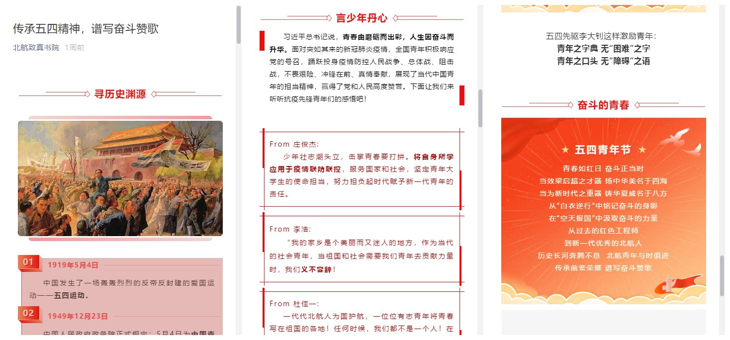 回顾过去,展望未来。致真书院于五四青年节当天推送题为《传承五四精神,谱写奋斗赞歌》的文章。以五四精神中的“爱国、进步、民主、科学”为核心,回顾了一代代青年和祖国共奋进,与时代同频共振的奋斗往事。习近平在给青年人的寄语中写到“青春由磨砺而出彩,人生因奋斗而升华”,在疫情防控中,致真书院也涌现了一批抗疫先锋,他们的经历鼓励致真学子努力担负起时代赋予青年的责任,砥砺奋斗,实现人生价值。