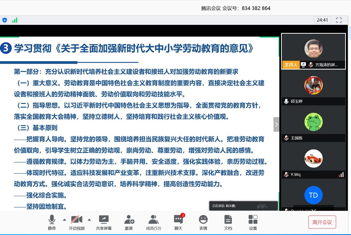 党委关于疫情防控工作的最新工作部署;支部宣传委员李烨领学了习近平总书记给北京大学援鄂医疗队全体“90后”党员的回信;支部纪检委员韩永鹏领学了《关于全面加强新时代大中小学劳动教育的意见》,介绍了文件发布背景和具体内容,引导全体教职工结合自己的工作,探讨对文件内容的理解。与会老师就如何全面加强新时代大学生劳动教育展开了热烈讨论,孙英蛟、赵雷、陈娇娇等6名教师表示在今后的教学工作中要贯穿吃苦耐劳精神的培养,更好地发挥劳动教育的协同育人作用;王虹霞以PPT的形式从文件的学习与理解、实践示例和举措分析等三个方面向大家汇报了学习心得。