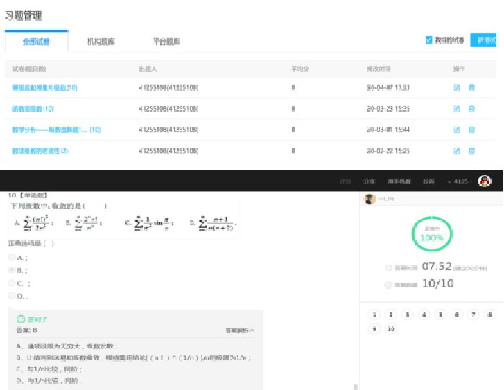 数学分析课程由于人数较多,即使在线下课堂师生面对面的互动交流的机会也并不多,因而很难发现所有的问题学生。但线上教学打破了师生交流时间和空间的局限,课程群通过腾讯课堂建设在线测验基本题库,平均每两周设置一次测验,教师可以根据教学进度自由组题,开展定期在线测验。测试完后系统会自动公布答案,并展示学生成绩,即时给出答案的解析。同时,每个题目都配有详细解答,学生做完后可以对照解答进一步理解,教师也可以对难点题目进行重点指导。通过科学有效的过程性评价,激励和引导学生学习,用数据了解判断学生的学习效果,根据学生的实际情况及时进行教学调整。