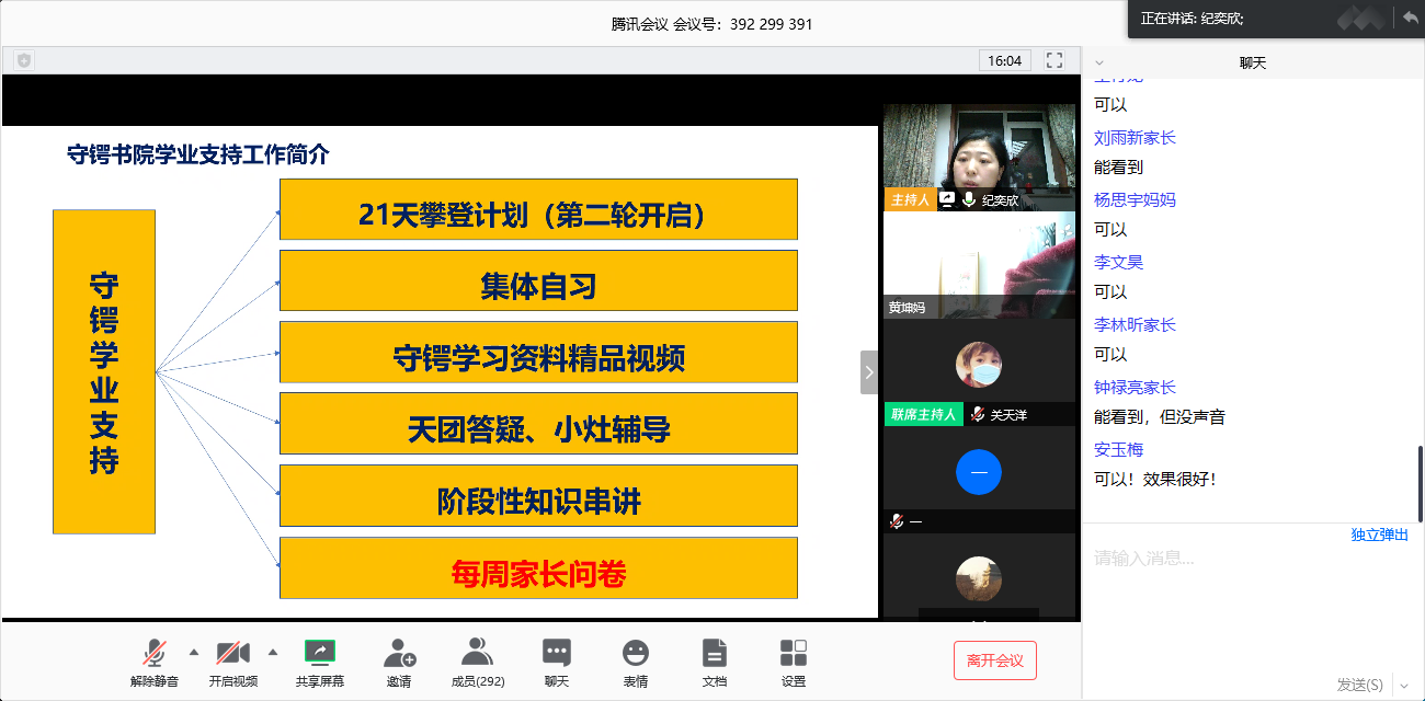 守锷书院在开展此次活动之前,先在家长群内发布问卷调查,针对当前学生网络学习过程中家庭亲子关系的满意程度、是否有参与家长课堂的需求和家长课堂的分享主题进行了调查。问卷结果显示,书院大部分家长对家庭亲子关系非常满意,对书院开设家长课堂非常感兴趣,分享主题当中“沟通”话题的得票数目高于其余主题,因此,书院经过一周的准备,于3月30日晚开展以“沟通”为主题的第一次家长课程。