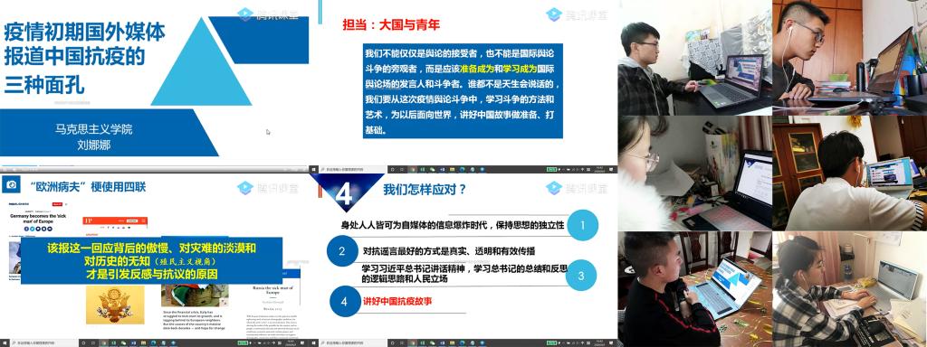 副教授刘娜娜老师讲授“大国战疫”系列专题思政课第一讲,主题为《疫情初期国外媒体报道中国抗疫的三种面孔》。课程充分展示抗击疫情的国际比较,从理论维度分析原因,明确了对待外媒的谣言和舆论诱导所应当持有的正确态度,并且树立了作为大国青年的信念与担当,作为疫情防控时期书院学生“学习日”和入党积极分子培养的补充环节,助力学生党员和入党积极分子增强“四个意识”、坚定“四个自信”、做到“两个维护”。