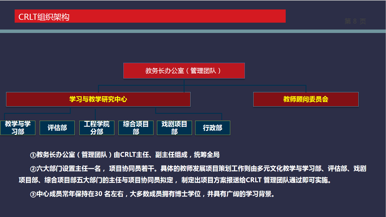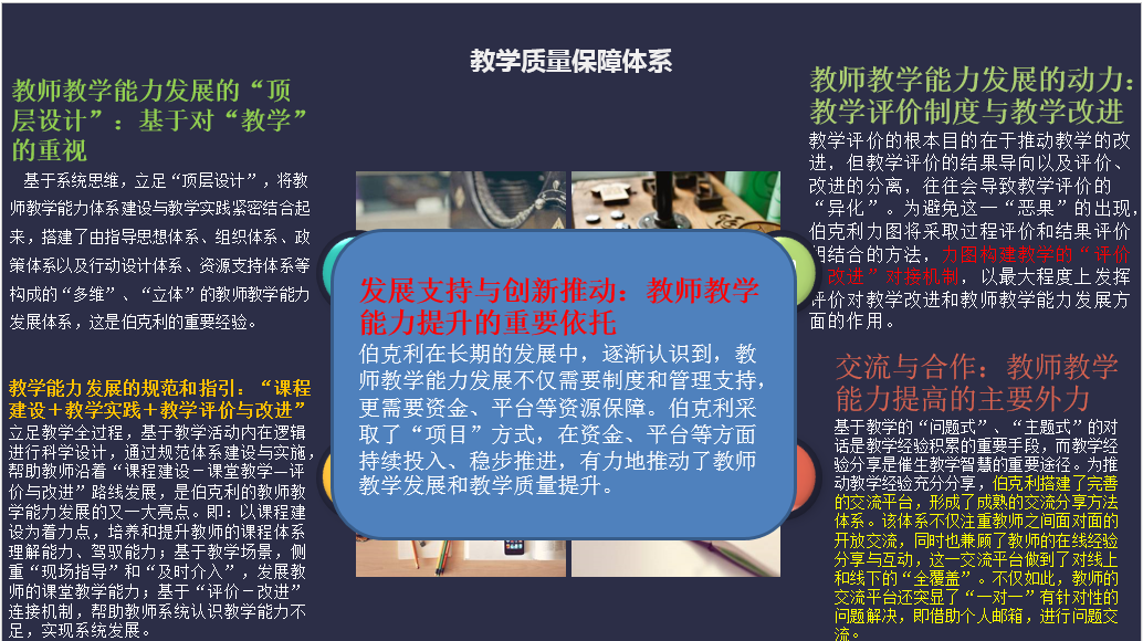 教师及同行认可的人员从事中心工作。此外,还采取了强化顶层设计重视教学文化;立足教学活动的内在逻辑,分别从“课程建设+教学实践+教学评价与改进”三个阶段形成教师教学发展的规范化指引;形成多维度多层次的教学评价与改进制度,形成教师教学能力发展的动力;加强交流与合作,形成教师教学能力提升的主要外力;不断推动教师改革与创新,形成教师能力提升的重要依托,五项措施构建教学质量保障体系,系统推动教师教学能力提升。并设立助教管理机构、明确助教责任与分类、开展助教招聘、培训、激励与评估等措施提升助教专业能力。