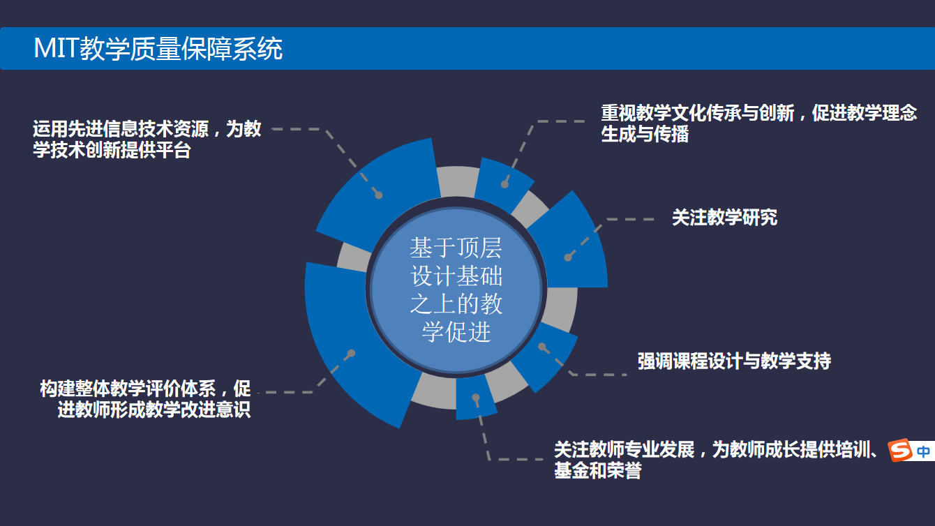 教学促进系统自建立之日就以“促进课程设计创新、促进教学方法创新、促进教育技术创新”为目标,形成了权责明确的专业化组织结构。为了更好地促进教师教学能力,首先重视教学文化、教学理念对于教学的质量保障的基础作用;其次关注教学研究价值;强调课程设计与教学支持;为教师教学发展提供培训、基金和荣誉;构建整体教学评价体系、促进教师教学改进的意识与行动;运用现代的信息技术与资源,为教学技术创新提供平台。基于上述措施构建MIT教学质量保障系统,不断促进教师教学能力提升。此外,设立助教学分课程及助教教学证书项目,为助教的发展提供支持。