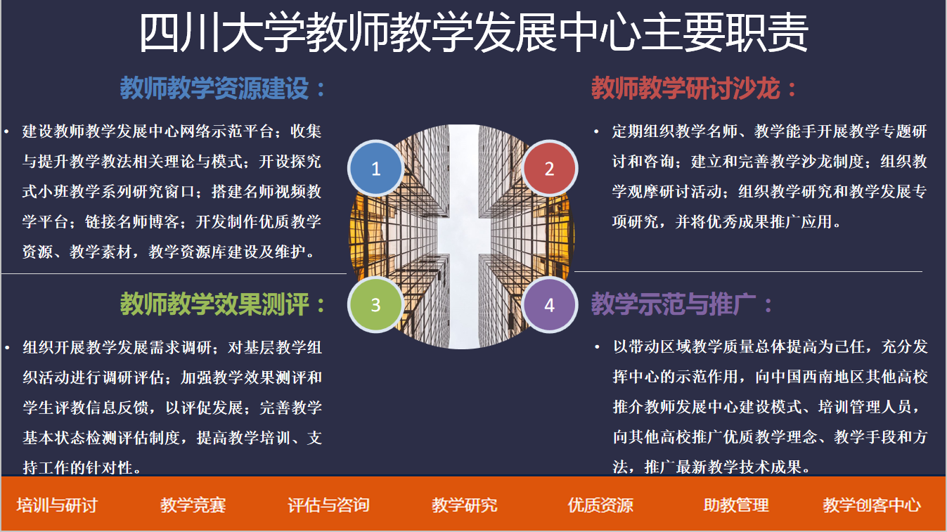 四川大学借鉴密歇根大学学习与教学研究中心的建设经验,创立了“融一流理念、重高水平服务”的四川大学教师教学发展中心。搭建了职责明确、教学经验丰富的专业化团队。开展教学资源建设、组织教师教学研讨沙龙、加强教学效果测评、进行教学示范与推广。为积极推动教师教学能力制定了一系列的激励与约束机制,提升教师改进教学的内生动力,并推动重奖激励;此外营造浓厚的教学文化氛围,搭建线上线下虚实结合的教学社区,提升教师教学能力。并关注助教培训与选聘,打造助教管理系统。通过对国内外四所高校的教师发展中心的调研,报告系统介绍了各中心为提升教师教学能力采取的措施,但同时也较为侧重各中心的异同的对比分析,为色情片