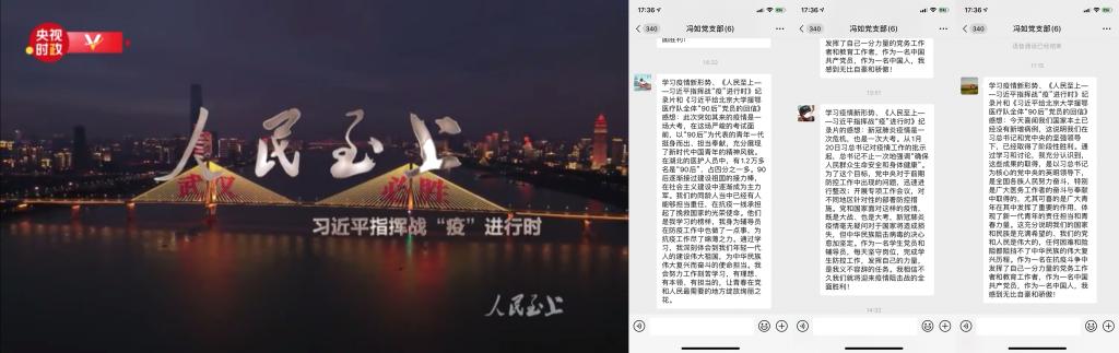 党支部围绕抗疫情时政,借助“学习强国”平台观看学习《人民至上——习近平指挥战“疫”进行时》,梳理了习近平总书记在抗击疫情各个阶段的精神脉络,彰显习近平总书记对人民健康安全的高度重视和坚决打赢疫情防控攻坚战的信心和决心。全体党员通过微信线上会议形式,各位党员在支部交流平台,集体学习共同讨论,积极发表学习感想,分享心得体会。并对照方案部署党支部近期重点工作,力求从严从实落实到位,增强了打赢疫情防控阻击战的信心和决心。