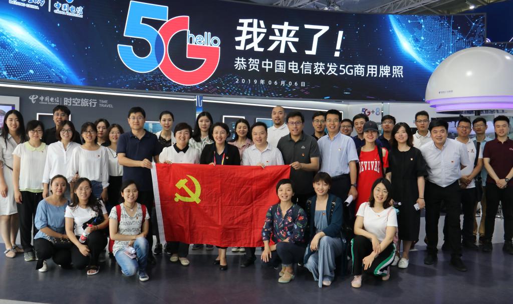 机关党支部与北京电信校园市场党支部全体党员在中国电信5G展馆前合影留念。