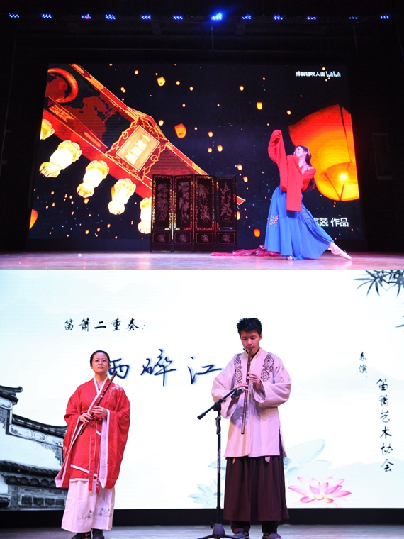 的何克兢同学为我们带来了舞蹈《惊鸿一面》;笛萧艺术协会的庄雅迪和景宇哲为我们带来了笛萧二重奏《雨碎江南》,优美舞蹈和悠扬乐曲,搭配诗词大会上选手们妙语连珠的表现,赢得了现场观众们一致好评。