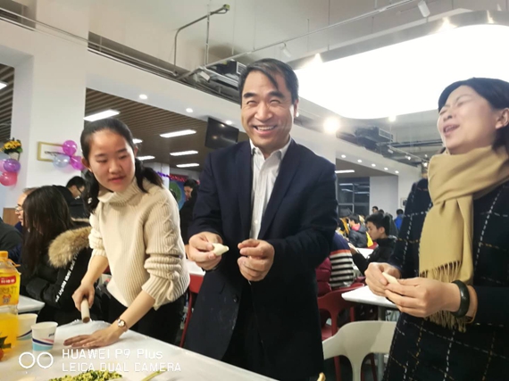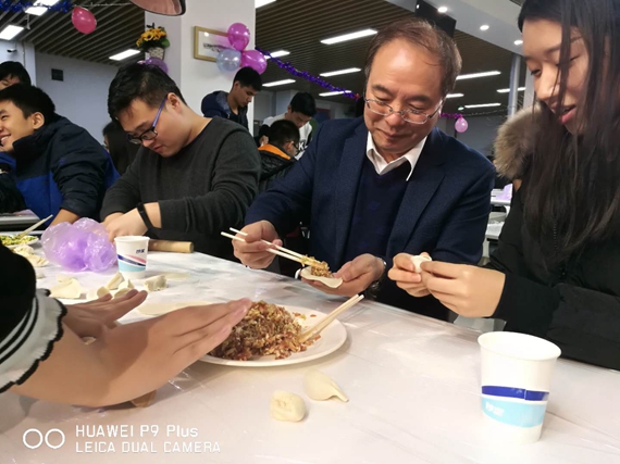 姚院长讲话结束后,晚会的主体部分——包饺子活动正式开始。同学们以各自所在的小组为单位,大展身手,一时间会场内充满了欢声笑语。同学们还充分发挥自己的想象力,创造性地包出了各种别具特色的饺子。李军锋副书记和姚仰平院长也加入到包饺子的队伍中,和同学们一起擀面皮包饺子,与大家共享新年的快乐与喜悦。