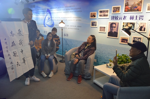 傍晚六时许,林德伟和林辉两位老师在同学们热烈的掌声中来到书院活动平台73°空间。座谈会伊始,“士谔志心社“的同学们为两位老师播放了书院的宣传片。随后,李今琪同学介绍了73°空间的设计理念以及主要用途,并从一名书院学生的角度阐述了自己对于院训“爱国 自信 博采 拓新”八个字的理解。冯佳琪同学在此基础上进一步向两位老师介绍了“士谔志心社”成立的初衷,社团学习传承林老精神的宗旨,以及社团未来的发展规划。同学们一致表示,作为士谔书院的学生,一定要努力学习、继承并发扬林老的精神,做一名合格的士谔志士。