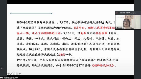 刘娜娜老师从抗美援朝的历史背景出发,结合《在纪念中国人民志愿军抗美援朝出国作战70周年大会上的讲话》和一些外国媒体歪曲事实的不当言论,强调我们这次抗美援朝出国作战完全是“以正义之师行正义之举”。