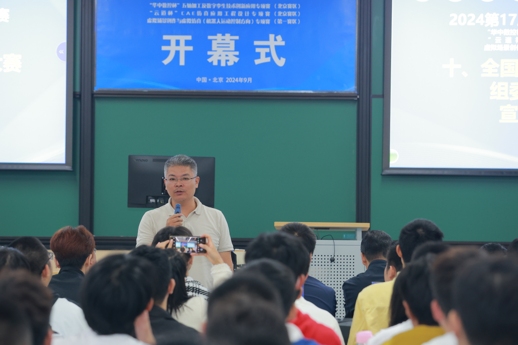 全国三维数字化创新设计大赛组委会副秘书长刘晓青宣布2024第17届全国三维数字化创新设计大赛“华中数控杯”五轴加工及数字孪生技术创新应用专项赛、“云道杯”CAE仿真应用工程设计专项赛、虚拟场景创作与虚拟仿真(机器人运动控制方向)专项赛正式开赛。