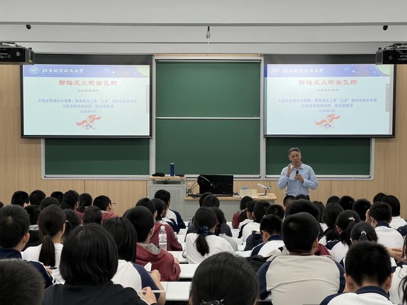 老教授报告团陈志英教授为师生一行带来《脚踏风火轮去飞翔》主题科普讲座。陈志英以哪吒“风火轮”为引,生动阐释了飞行器升力与推力等基本原理,并介绍了飞机、火箭等不同飞行器的运行特点,并围绕中国空间站建设、载人航天工程、嫦娥探月、天问一号火星探测等重大科技成就,进一步讲述了科技创新和科学探索的重要意义,勉励学生们厚植家国情怀,涵养科学精神,树立探索未知、勇于创新的志向。