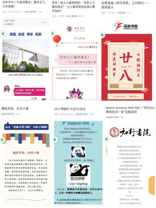 寒假以来,*色情片 持续关注在校、返乡学生动态,各书院辅导员全覆盖摸排学生情况,开展习惯打卡、传统文化分享、假期生活分享、好书推荐等系列线上活动,丰富学生假期生活,营造温馨、充实、有意义的年味寒假。