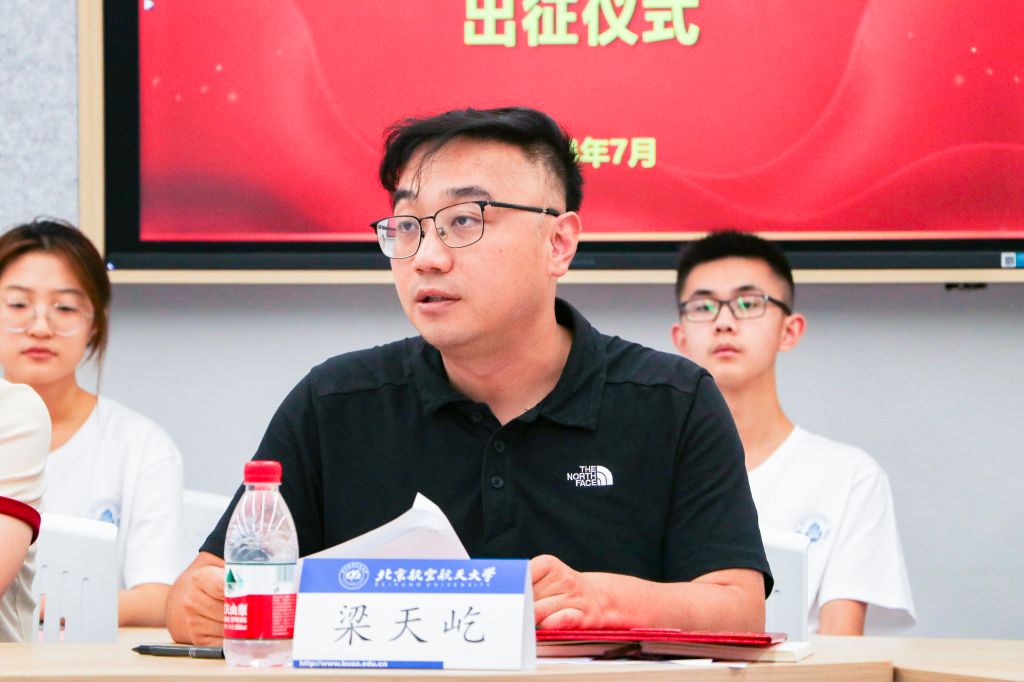 志愿服务队指导教师代表梁天屹发言,他表示,社会实践是大学生拓展国情视野、理解大政方针、体验社会民情的绝佳场景。希望同学们能够真正走进社会,感受新质生产力发展视域下的革新与挑战,理解乡村振兴的深刻含义,在实践中受教育、长才干、做贡献。
