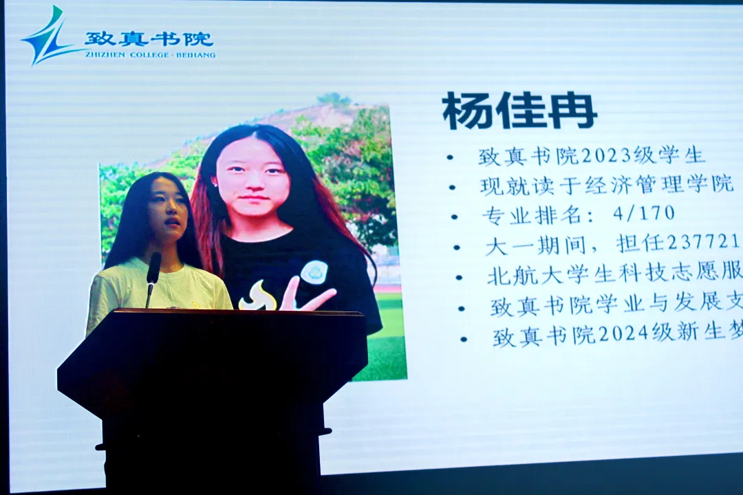 2023级学生代表杨佳冉同学、2024级新生代表庄辉腾同学分别上台发言。杨佳冉同学回忆了自己初入大学的青涩懵懂,分享了自己一年作为“追光者”的成长和收获。庄辉腾同学表达了自己对理科探索以及与梦拓和导员携手并进的憧憬,展现出24届新生积极进取的蓬勃朝气。两位同学的讲话生动地体现出致真书院“家文化”的传承。