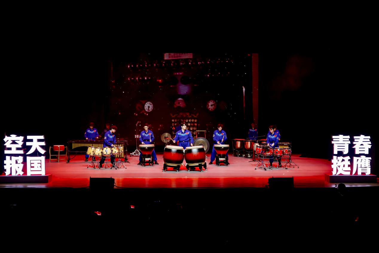 学生民乐团奏响《鼓赞东方》,阵阵鼓声慷慨激昂,诉说着航天人的奋斗故事,表达对航天先驱的崇高敬意。
