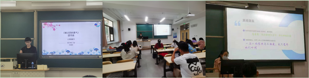 5月5日下午,90余名同学进行线下读书会,来自凌云文学社的闫泽林、王子瑜和陈梦欣三位同学做为小组长带领各小组,分别导读了《被讨厌的勇气》、《蛤蟆先生去看心理医生》和《爱的五种语言》三本影响广泛的心理学作品。读书会现场大家认真聆听,积极参与讨论,现场气氛活跃而融洽。通过线下读书会,同学们收获了心理学小知识,认识了通向个人心理成熟的道路;一定程度上扫除了消极心理和行为模式,增强了正能量;对于两性关系以及人际关系、沟通交流的认识都得到了提升,收获颇丰。