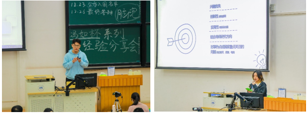 此次经验分享会中,两位同学分享了有关选题、创作、答辩等方面的经验,为同学们参加“冯如杯”提供建议,答疑解惑,拓宽思路。徐逸伦侧重“冯如杯”选题,为同学们列出了“兴趣优先”、“创新性”、“实用性”、“结合导师研究方向”和“时事热点或国家重点关注问题”五大选题生发点作为参考;张嘉轩就“时间把控”、“内容主次”、“PPT制作”和“提问环节”四个方面对现场答辩分享了自己的经验。
