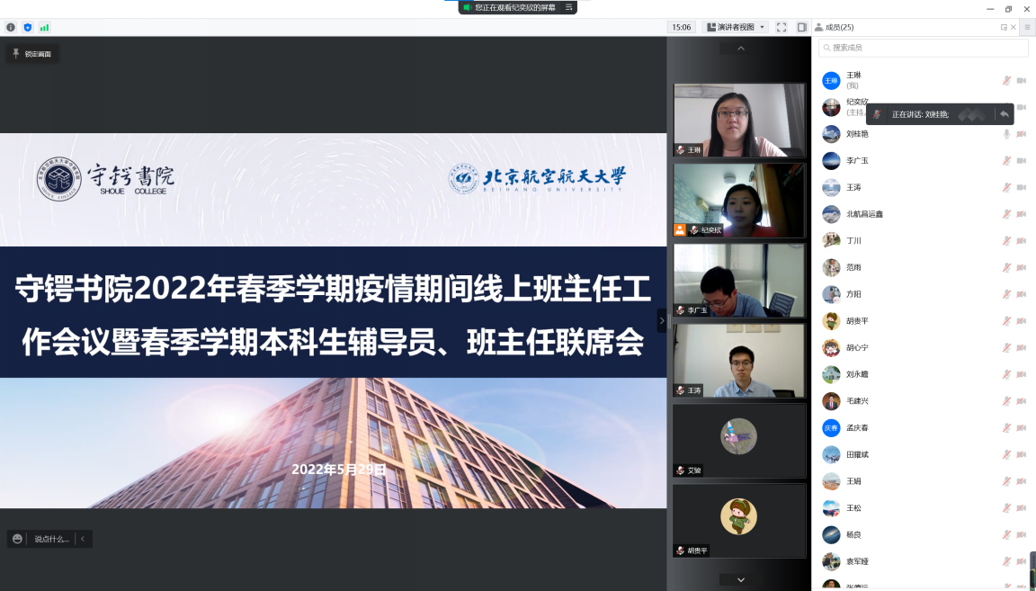 守锷书院在腾讯会议平台召开疫情期间线上班主任工作会议暨春季学期本科生辅导员、班主任联席会。院长张德远、学业总导师孟庆春、执行团队成员和书院2021级15位班主任参加本次会议。本次会议由学业助理纪奕欣主持。