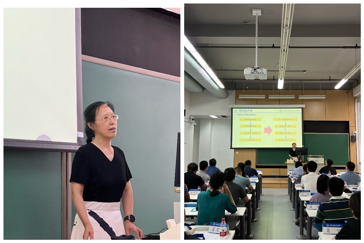 学业总导师王少萍老师对与会老师进行了导师、班主任工作培训。首先介绍了秋季学期导师制工作的基本情况,包含导师选聘原则、导师在大类培养招生书院培养模式的作用、导师体系构架、导师制度、导师职责、导师工作内涵和目标、导师工作内容及导师职责要求等内容;其次介绍了班主任工作重要性、岗位职责、工作原则、工作制度等内容。她强调了新学期对导师、班主任的工作期望,要“以学生为本、因材施教”,希望导师班主任们能够帮助大一的学生从高中趋同的人生模式转变到大学自主个人的人生模式,为学生做出示范,做好引领者,要尊重学生的个性和思想,寓教于乐,引导学生热爱生活、选择适合自己的专业,让学生真正地感受到“大师在身边”。