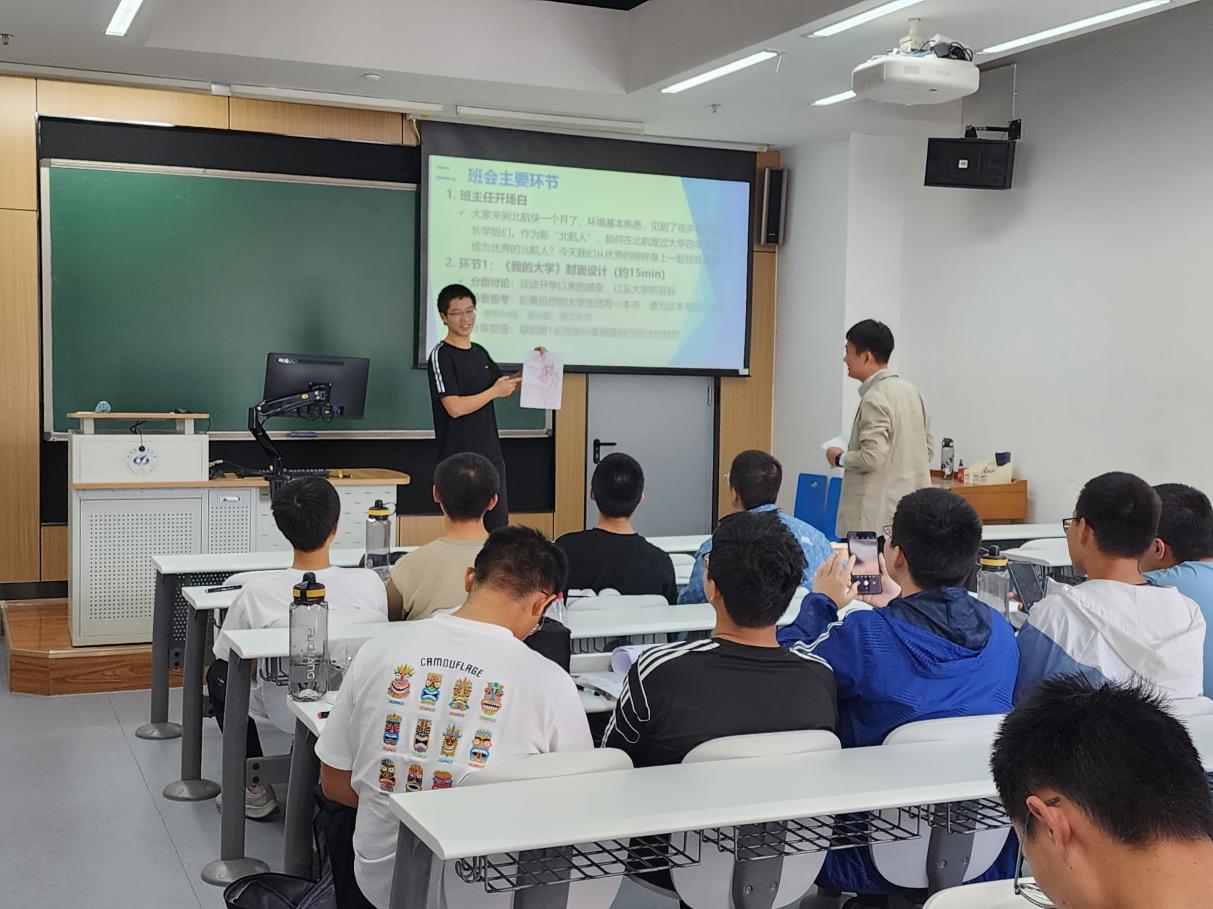 237614班班主任安朝老师将班级学生分成5个小组进行各环节的讨论与分享,邀请优秀学长分享学习经验与心得体会,学生思考并展示了自己大学的目标,现场气氛活跃,学生们讨论积极。