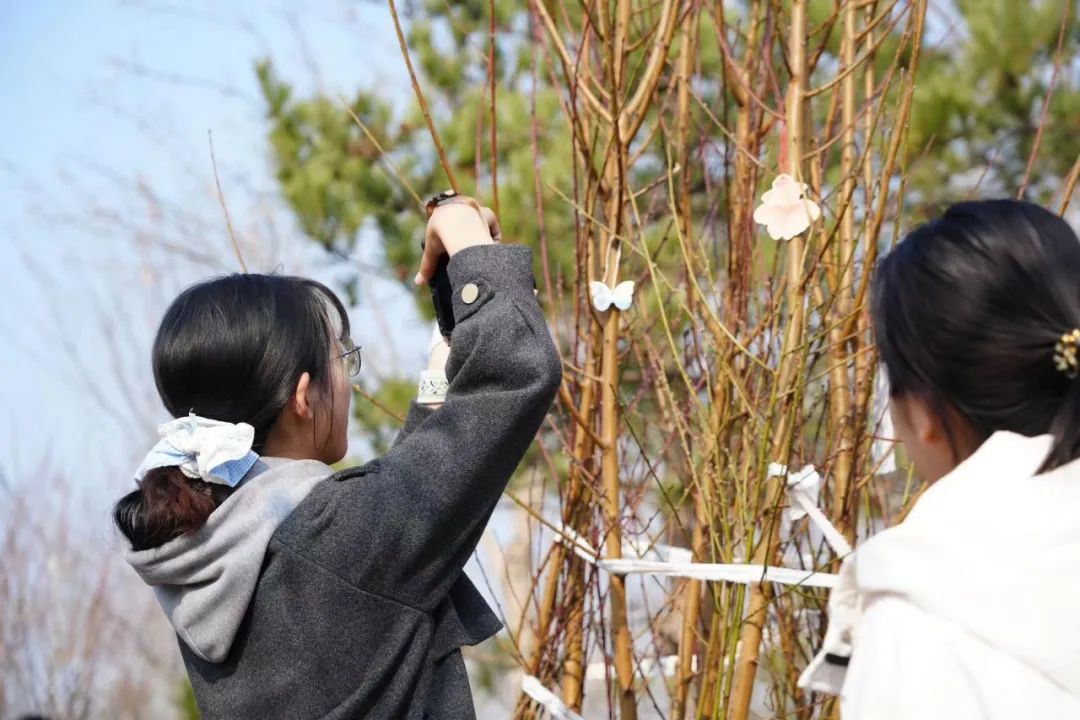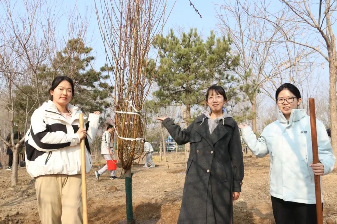 活动当天,同学们踏着浅金色的晨曦早早到达温榆河公园·故城记忆,分小组作业,立苗、培土、浇水,现场繁忙有序。树苗枝桠向阳生长,祈愿卡片随风飘摇。漫步青山绿水,栽植一片新绿,奏响人与自然的和谐乐章。