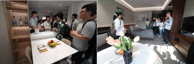 在人才公寓云尚社区,学子们深入了解了园区为异地人才精心打造的优质住房保障体系。参观样板间及共享空间时,大家切实感受到了园区在满足社交与办公需求方面的用心设计。从便捷的轻餐便利店,到功能齐全的共享办公空间以及充满活力的运动街区,一应俱全的配套设施让同学们不禁感慨:“在这里,生活的便利与工作的高效完美融合,为创业者提供了坚实的后盾,让他们能够心无旁骛地追逐梦想。”