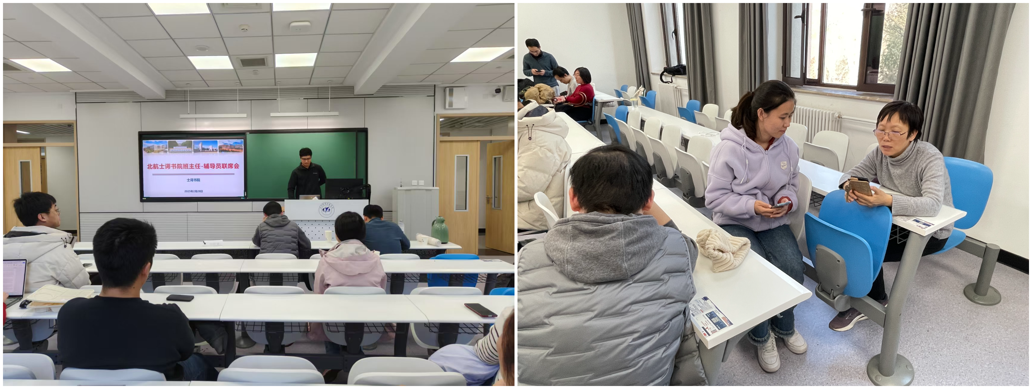 班主任辅导员联席会上,士谔书院专职辅导员武在洽向班主任们分析了上学期各小班的学习情况,并进一步对班主任工作安排作出整体介绍,从班主任与辅导员工作职责与侧重、班主任工作要求、考核管理与评优等方面作出详细阐释。会议后,班主任与带班辅导员根据学生们的具体情况,共同讨论了针对性的应对策略,进一步凝聚育人合力。
