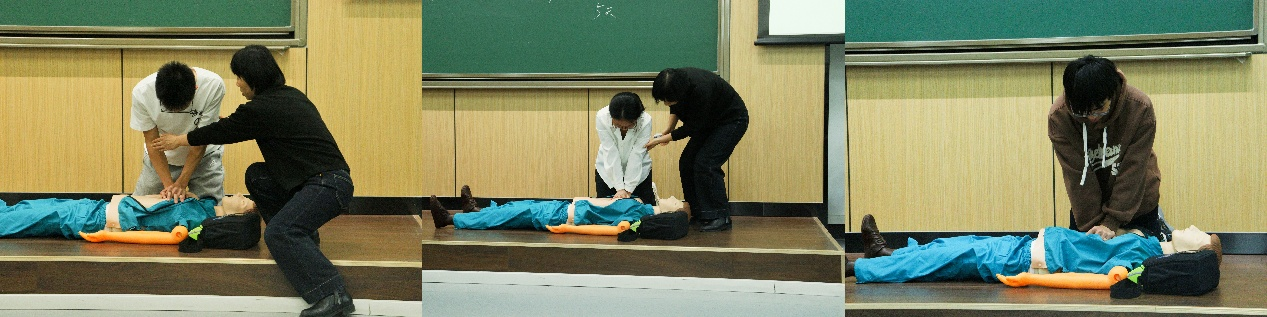 随后,卢艳老师针对心脏骤停的识别要点与常见诱因进行说明,重点讲解成人心肺复苏术(CPR)的标准步骤及自动体外除颤器(AED)的使用方法,强调“黄金五分钟”内实施有效救护的重要性。董艳华老师借助人体模型进行现场演示,并邀请 学生上台实操,给予细致指导。